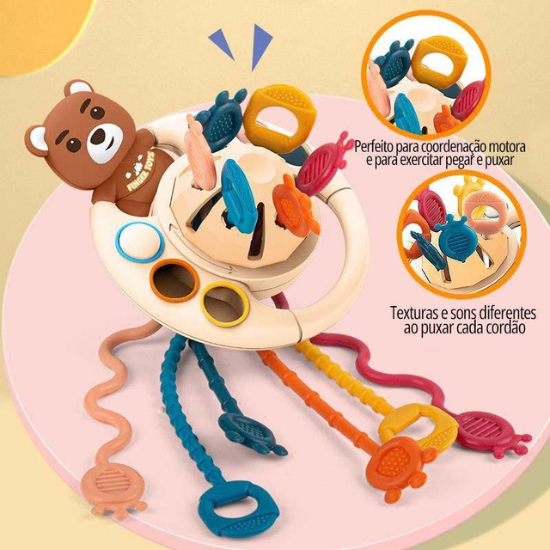 Com design lúdico e seguro, feito em silicone macio, o brinquedo convida o bebê a morder, puxar, apertar e explorar diferentes texturas e movimentos — estimulando os sentidos de forma divertida.